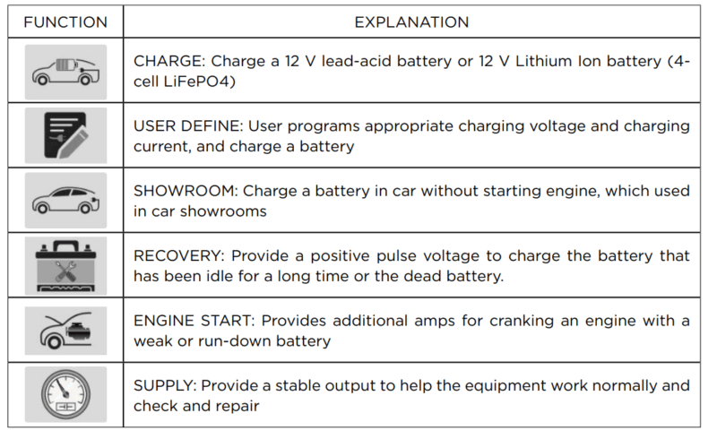 - Accutype: alle soorten 12 V loodzuur-en 12 V lithium-ionaccu’s (4-cel LiFe PO4)
